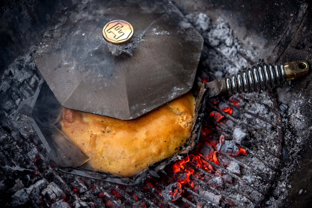 We recently partnered with Chef Carlo Lamagna, one of Food & Wine’s Best New Chefs of 2021 to bring you this scrumptious Filipino coconut-rice cake. Cooked and served in our 10" FINEX Cast Iron Skillet it brings some of the best Filipino flavors to your table. Bibingka, is a popular breakfast or merienda (snack) food. Traditionally, it’s placed on a banana leaf-lined terra cotta pot and baked in a clay oven with pre-heated coals. In this instance, Chef Carlo, replaced the terra cotta pot with a 10″ FINEX cast iron Skillet and baked it over a wood fire.